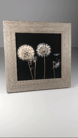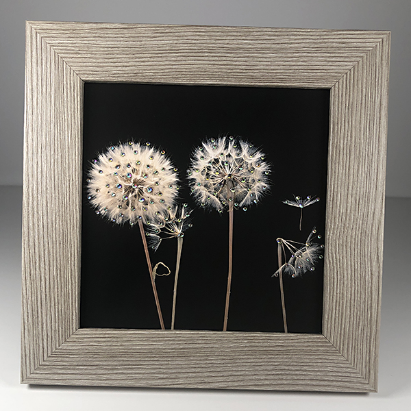 Four Dandelions 6"x6" print embellished with crystals and framed as pictured, overall size is 8"x8". Items are made to order and may take 4-6 weeks for delivery.
