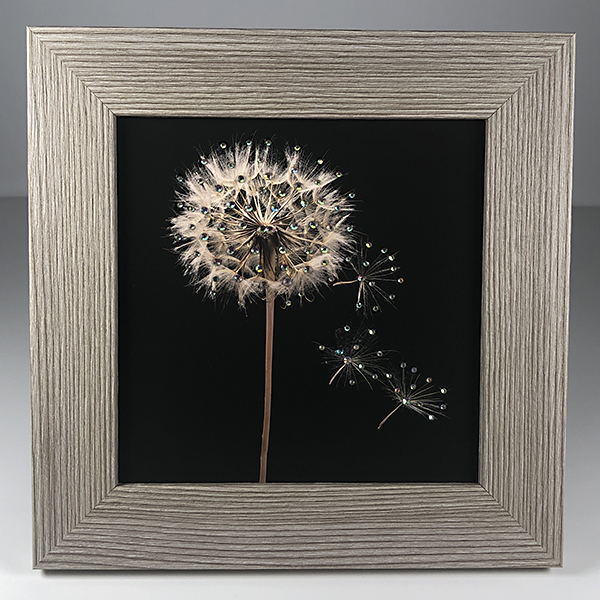 Single Dandelion 6"x6" print embellished with crystals and framed as pictured, overall size is 8"x8". Items are made to order and may take 4-6 weeks for delivery.